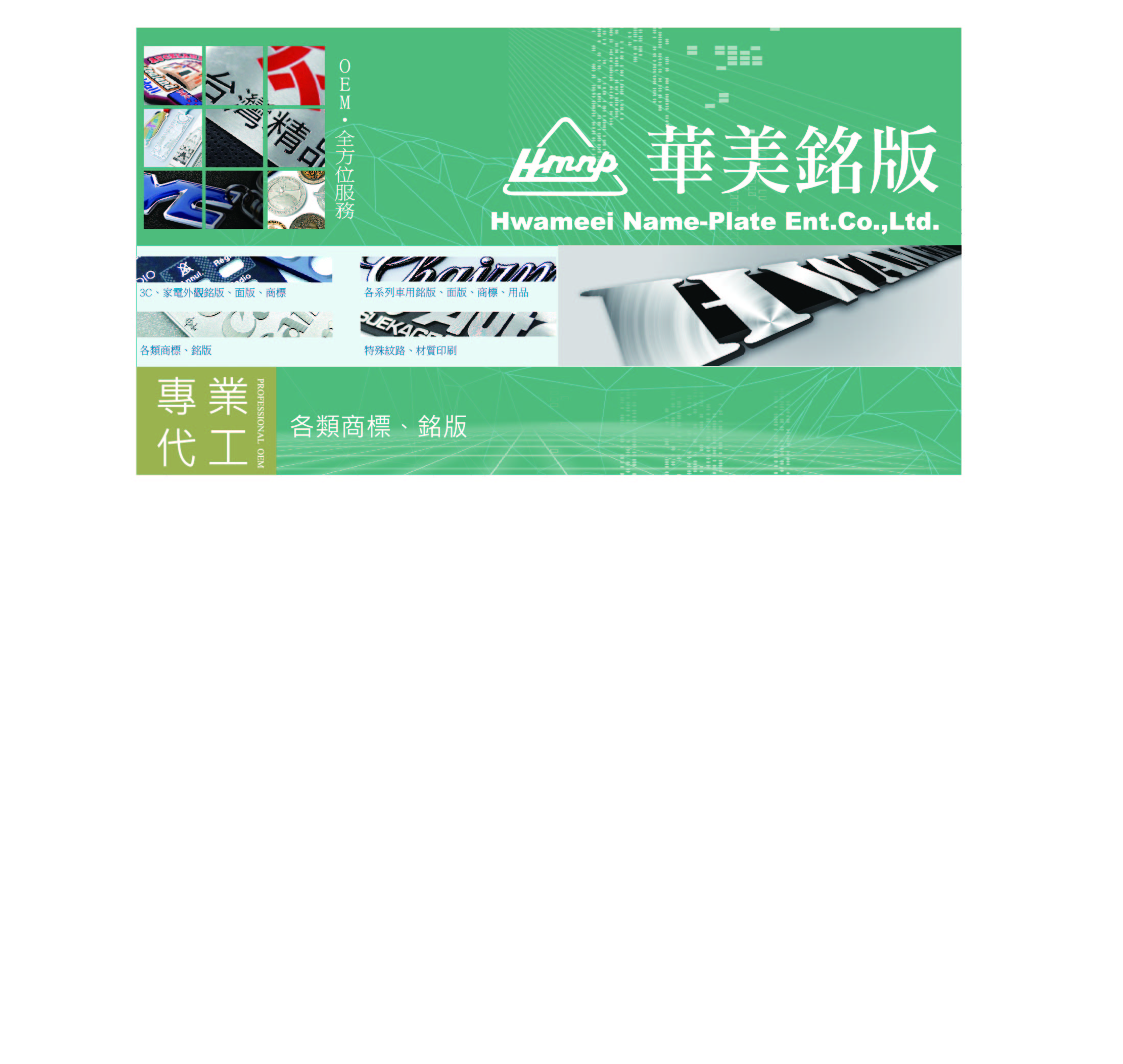 華美銘版股份有限公司創立於1976年,迄今已有四十餘年的經驗。公司創立以來一直本著『品質、服務、創新』之經營理念,除不斷致力於產品品質的提昇外,更基於『產品多元化、品質第一』的營策略,擴增了許多產品製作的項目,其項目涉及各行各業之需求;從手機、3C、電腦、家電、汽機車、各式機械、傢俱、禮贈品、個性化商品…等。來滿足廣大客戶層的不同需求,是一家專業製造廠。